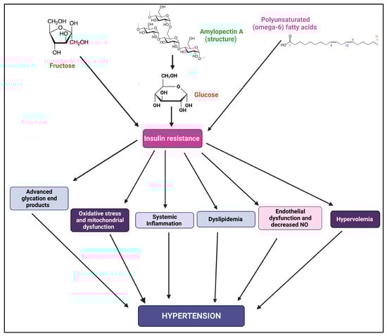 Hypertension is mainly related to aging, environmental stress, and genetic susceptibility [4]. The prevalence of hypertension has changed, although not consistently, all over the world. High-income countries have shown a decline in the prevalence of hypertension during the last two decades, whereas low- and middle-income countries have witnessed a notable increase [3]. Since hypertension is responsible for causing various problems, the main aim of the present review was to highlight the role of insulin resistance (IR) in inducing hypertension and the detailed mechanism of its pathogenesis. We also discuss the dietary factors that cause IR and reveal that a low-carbohydrate, high-fat (LCHF) diet can be beneficial for reversing this condition.