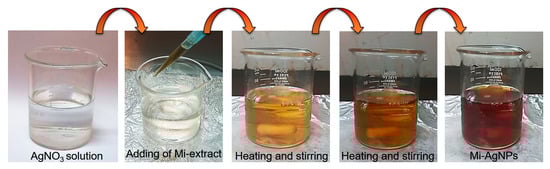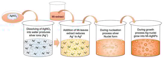 - Rajeshkumar, S.; Bharath, L.V. Mechanism of plant-mediated synthesis of silver nanoparticles -A review on biomolecules involved, characterization and antibacterial activity. Chem. Biol. Interact. 2017, 273, 219–227. [Google Scholar] [CrossRef]