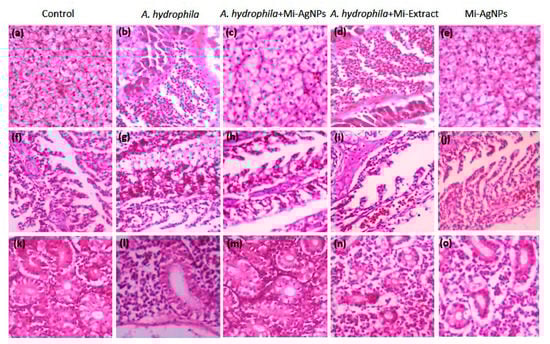- G4: A. hydrophila challenged + Mi-AgNPs-administered in aquaria water on a daily basis at a concentration of 0.05 mg/L),