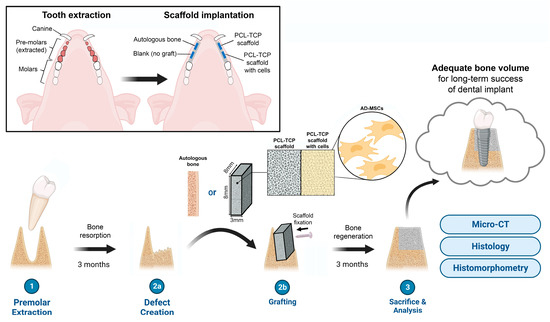 Schematic overview of the study, illustrating the major procedures and the location of the tooth extraction and scaffold implantation in the pig mandible. Adapted from “Dental Implant Procedure in Pigs,” by BioRender.com (2023). Retrieved from https://app.biorender.com/biorender-templates (accessed on 4 April 2023).