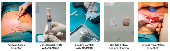 Representative images from the implantation surgery, where the adipose tissue was extracted and concentrated into a stromal vascular fraction rich in AD-MSCs. The injectable SVF graft was loaded into a porous PCL-TCP scaffold via a 21 G needle and the loaded scaffold was implanted laterally on the buccal side of the alveolar ridge. Reproduced with permission from Mary Ann Liebert, Inc. publishers, the publisher of this copyrighted figure.