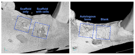 Representative µCT images of mandibular segments harvested 3 months after the implantation surgery, with the defect sites marked in dashed lines. Length of each square = 8 mm (µCT images generated by VGSTUDIO MAX 2023.1 software.).