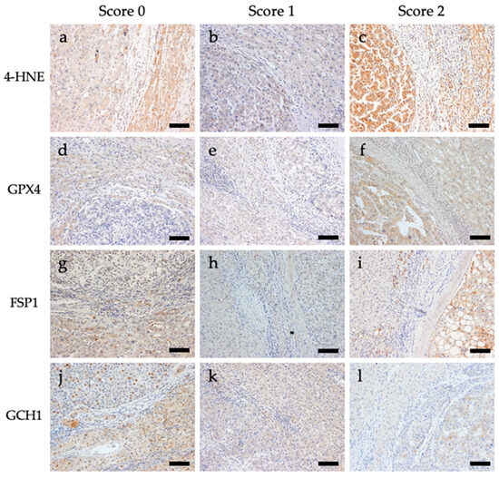 Representative images of immunohistochemical staining of 4-hydroxynonenal (4-HNE), glutathione peroxidase 4 (GPX4), ferroptosis suppressor protein 1 (FSP1), and guanosine triphosphate cyclohydrolase 1 (GCH1) in tissues from patients with hepatocellular carcinoma. All images are shown at a magnification of 200×, and the scale bars indicate 50 µm. (a) 4-HNE score 0, (b) 4-HNE score 1, (c) 4-HNE score 2, (d) GPX4 score 0, (e) GPX4 score 1, (f) GPX4 score 2, (g) FSP1 score 0, (h) FSP1 score 1, (i) FSP1 score 2, (j) GCH1 score 0, (k) GCH1 score 1, and (l) GCH1 score 2.
