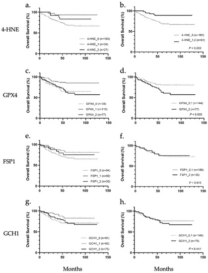 Overall survival analysis of hepatocellular carcinoma stratified according to immunohistochemical staining of 4-hydroxynonenal (4-HNE), glutathione peroxidase 4 (GPX4), ferroptosis suppressor protein 1 (FSP1), and guanosine triphosphate cyclohydrolase 1 (GCH1). (a) Classification into three groups based on 4-HNE staining intensity showed no significant association with overall survival. (b) 4-HNE score 0 group showed significantly worse prognosis than 4-HNE score 1 and score 2 groups (p = 0.003). (c) Classification into three groups based on GPX4 staining intensity showed no significant association with overall survival. (d) GPX4 score 2 group showed significantly worse prognosis than the GPX4 score 0 and score 1 group (p = 0.005). (e) Classification into three groups based on FSP1 staining intensity. (f) None of the groups (FSP1 score 0, 1, and 2) were significantly associated with overall survival. (g) Classification into three groups based on GCH1 staining intensity. (h) None of the groups (GCH1 score 0, 1, and 2) were significantly associated with overall survival.