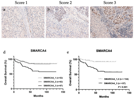Representative images of immunohistochemical staining of SWI/SNF-related, matrix-associated, actin-dependent regulator of chromatin, subfamily a, member 4 (SMARCA4) in tissues from patients with hepatocellular carcinoma (HCC). (a) Score 1, (b) score 2, and (c) score 3. Overall survival analysis of HCC based on SMARCA4 staining intensity. (d) Classification into three groups based on SMARCA4 staining intensity showed no significant association with overall survival. (e) SMARCA4 score 3 group showed significantly worse prognosis than SMARCA4 score 1 and score 2 groups (p < 0.001).