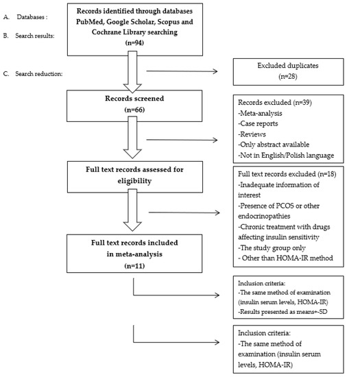 To include articles in our systematic review, we decided to apply the following selection criteria: an original paper, using the same method of examination of insulin serum levels, and the HOMA-IR and results being presented as a mean ± SD or median with a range. To exclude any possible impact from other abnormalities on IR development, we decided to apply the following exclusion criteria: the presence of PCOS or other endocrinopathies and treatment with drugs affecting insulin sensitivity. The process for study selection is presented in Figure 2.