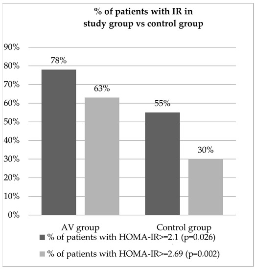 Nevertheless, if the HOMA-IR cut-off value for our study was established as 2.69, then, 26 out of the 41 patients would be diagnosed with IR (63%), and 14 out of the 47 controls would be diagnosed with IR (30%), with the difference being even more significant (p = 0.002). The results of the calculated HOMA-IR, shown as the percentage of patients diagnosed with IR in both groups, are presented in Figure 3.