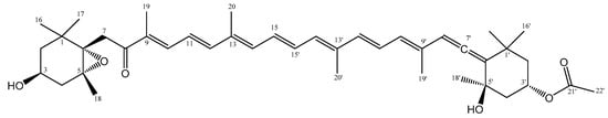 Fucoxanthin (1) was isolated using a silica gel 60 column with a particle size of 0.040–0.063 mm (230–400 mesh) from Merck and Sephadex LH-20 (Sigma) and eluted with a mixture of n-hexane/acetone and dichloromethane/methanol solvents.