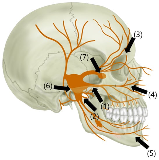 A nerve block plays an important role in the diagnosis, prognosis, and treatment of pain by intercepting the vicious cycle of pain, blocking sympathetic nerves, expanding vessels in the lesion area, and improving local blood flow []. Peripheral interventions involve blocking or destroying a portion of the trigeminal nerve distal to the Gasserian ganglion [] (Figure 4). Complications include bleeding, infection, sensory abnormalities, and, rarely, diplopia []. Fluoroscopy-guided blocks are standardly performed with an observation of the absence of intravascular contrast spread before injecting local anesthetics []. Ultrasound provides real-time images of adjacent tissues, bony structures, and vessels and guides the needle trajectory to the target region without radiation exposure [,]. However, obtaining high-quality ultrasound images may be technically difficult in the deep trigeminal nerves. Nevertheless, in one study, a maxillary nerve block via the pterygopalatine fossa was successfully performed using ultrasound [].