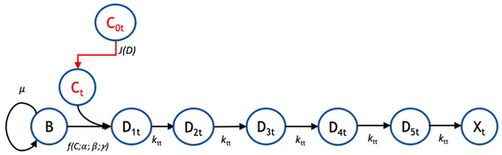 Pharmacodynamic model structure for tobramycin. The pharmacodynamic model for response to tobramycin (subscript ‘t’) tracks the transit of biofilm cells going from a viable (B) to nonviable state (Xt) following administration of tobramycin at bulk concentration C0t. There is a flux, J(D) of drug from the bulk to the biofilm cells, where the local concentration is Ct. For tobramycin, there are five transit compartments (D1t, D2t, D3t, D4t, and D5t) mediating the cellular response to drug. Growth is governed by a specific growth rate, μ; the coupled diffusion and pharmacodynamic response are subject to parameters α, β, and γ; and the transit rate to subsequent compartments is given by ktt.