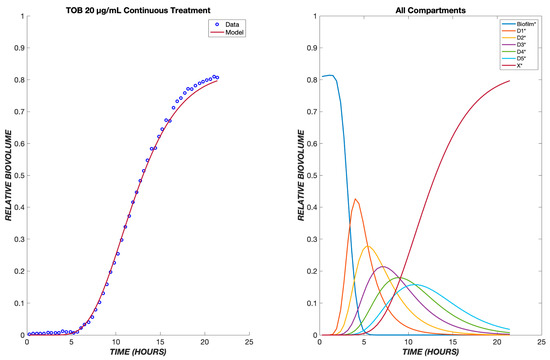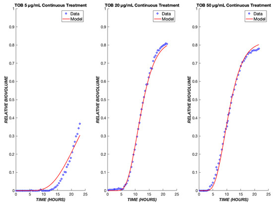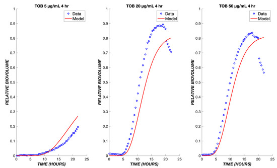 The model was first tested on data for P. aeruginosa treated with tobramycin (TOB). The mechanism of action for tobramycin involves binding to the 30S ribosomal unit, thereby inhibiting protein synthesis, which gradually incapacitates the bacterium and ultimately induces cell death [12]. This is a prolonged process, which was modeled using five transit compartments, as described in Section 2. At the TOB 20 µg/mL concentration, experimentally, there is a delay of approximately 5.5 h between drug exposure (with the dead volume of the system already taken into account) and the emergence of nonviable biovolume, which subsequently increases rapidly (Figure 2). This behavior is captured by the model following a continuous treatment of TOB for 24 h. The time required for the drug to diffuse to the biofilm is seen within the flat region of the graph, and as the cells progress through the transit compartments, they are still viable until death in the X* compartment. After the composite time for drug diffusion and cellular compartment transit, there is a rapid increase in the number of dead cells observed experimentally and predicted by the model. For the other studied concentrations of tobramycin, 5 and 50 µg/mL, the proposed model shows the same pattern of delay, progression through the transit compartments, and increase in the dead biovolume population, all of which are consistent with the experimental results [9].