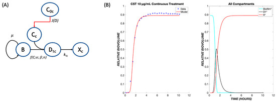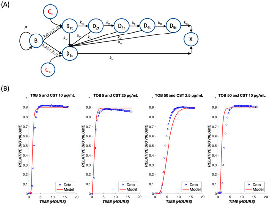 Since TOB and CST have different mechanisms of action, they might produce additive or synergistic effects when used in combination. If there are no strong synergies or antagonisms, the original model may be able to predict outcomes of combined treatments using only the parameters determined earlier for each respective drug. The model proposed for this mechanism involves a combination of both treatments running in parallel (Figure 8A). It proved necessary to add a path by which the biofilm cells could initially be affected by TOB or CST, and the cells in transit due to (slower-acting) TOB exposure could be killed directly by (faster-acting) CST. It is assumed that cells in a transit compartment due to TOB were equally likely as naïve cells to be affected by CST; thus, this path does not introduce any additional fitting parameters into the model. Because of the more rapid killing mechanism of CST, the response to CST dominates the experimentally observed and model behaviors (Figure 8B), where the biofilm cell death occurs at earlier times, even with lower concentrations of CST.