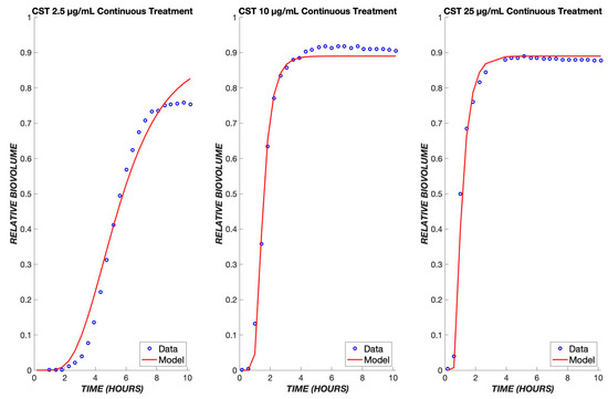 Transient exposure of biofilms to colistin. The same set of parameters for the continuous data was used to simulate the treatment of biofilms using colistin for four hours at concentrations of 2.5, 10, and 25 µg/mL. The experimental data are shown in blue, and the model is shown in red.