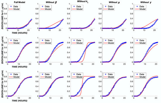 In order to better understand the influence of model structure and parameter values on the model output, several analyses were performed. First, each component of the model was removed in turn and the model re-fit to the experimental data (Figure 9), with the exception of the cell killing component (α parameter), which would give a trivial result. The removal of either the diffusion term or the transit compartment terms significantly reduced the ability of the model to capture the dynamics of the biofilm response across the three different concentration levels of TOB. Likewise, removing cooperativity from the model (i.e., constraining the cooperativity parameter, γ, to a value of one) prevented an accurate reflection of the concentration dependence. The removal of bacterial growth, μ, did not have a major effect on the model output. However, when neglecting this parameter in the optimization program, the error between the model and data was increased by 60% in comparison to incorporating growth rate (Table 2). As a result, the growth rate was retained in the model.