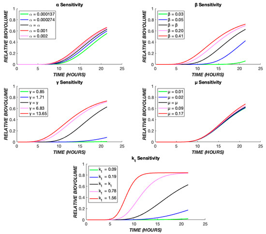 Parametric sensitivity analysis. The TOB 20 µg/mL continuous data were used as the base case. The time course of dead biovolume (X*) production was compared for values of each parameter, varied one at a time. The black line represents the output when the parameter is at its best fit value (Table 1), the red and pink lines show the effect of higher values, and the green and blue lines illustrate the effect of lower values of each parameter.