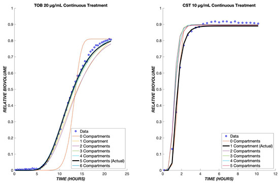 Optimal number of transit compartments. The TOB 20 µg/mL and CST 10 µg/mL continuous data were used to determine the ideal number of compartments for the model. On the left graph, the model with three compartments gave the least error between the model and data for tobramycin. The graph on the right shows the model with a differing number of compartments for colistin, and as shown, only one compartment produced the least error between the model and data. The parameter values for each compartment can be found in the tables below.