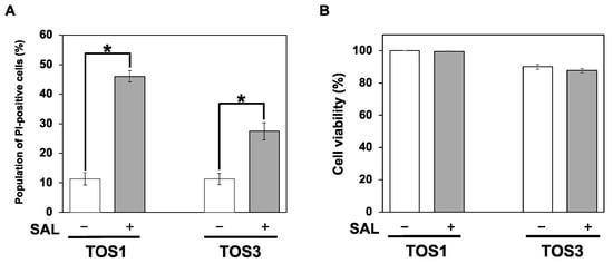 3.2. PI Uptake by and Viability of SAL-Treated TOS1 and TOS3 Cells