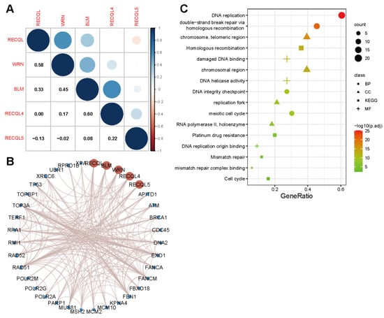 RECQ family genes and function prediction. (A) A correlation between mRNA expression in RECQs. (B) The PPI network analysis of RECQs was exhibited from String. (C) Analysis of GO and KEGG enrichments by interacting proteins.