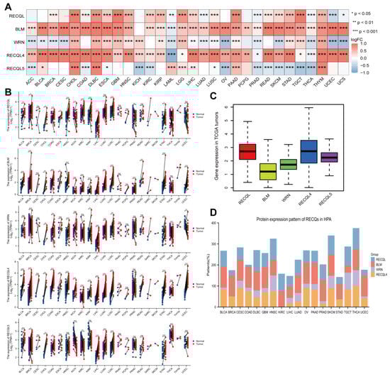 Expression level of RECQ family in pan-cancer. (A) GTEx and TCGA were used to assess the differential mRNA expression of RECQs in tumor and normal tissues. (B) TCGA paired cancer and para-cancer mRNA expression of RECQs. (C) Expression of RECQs at the total mRNA level in pan-cancer. (D) Variations in the expression of RECQ proteins among different HPA tumors. * p < 0.05, ** p < 0.01, *** p < 0.001. ACC, adrenocortical carcinoma; BLCA, bladder urothelial carcinoma; BRCA, breast invasive carcinoma; CESC, cervical squamous cell carcinoma and endocervical adenocarcinoma; CHOL, cholangiocarcinoma; COAD, colon adenocarcinoma; DLBC, lymphoid neoplasm diffuse large B-cell lymphoma; ESCA, esophageal carcinoma; GBM, glioblastoma multiforme; HNSC, head and neck squamous cell carcinoma; KICH, kidney chromophobe; KIRC, kidney renal clear cell carcinoma; KIRP, kidney renal papillary cell carcinoma; LAML, acute myeloid leukemia; LGG, brain lower-grade glioma; LIHC, liver hepatocellular carcinoma; LUAD, lung adenocarcinoma; LUSC, lung squamous cell carcinoma; MESO, mesothelioma; OV, ovarian serous cystadenocarcinoma; PAAD, pancreatic adenocarcinoma; PCPG, pheochromocytoma and paraganglioma; PRAD, prostate adenocarcinoma; READ, rectum adenocarcinoma; SARC, sarcoma; SKCM, skin cutaneous melanoma; STAD, stomach adenocarcinoma; TGCT, testicular germ cell tumors; THCA, thyroid carcinoma; THYM, thymoma; UCEC, uterine corpus endometrial carcinoma; UCS, uterine carcinosarcoma; UVM, uveal melanoma.