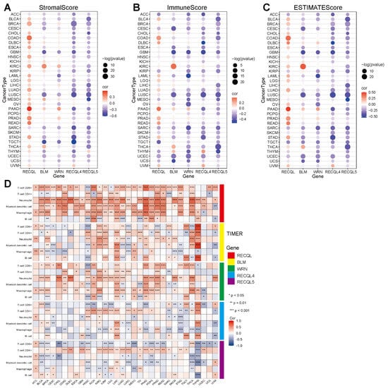 A correlation analysis of RECQ family expression and pan-cancer microenvironment. (A–C) To analyze the correlation between RECQs and StromalScores, ImmuneScores, and ESTIMATEScores. (D) An analysis of the correlation between RECQs mRNA expression and immune cell types at TCGA by TIMER. * p < 0.05, ** p < 0.01, *** p < 0.001.