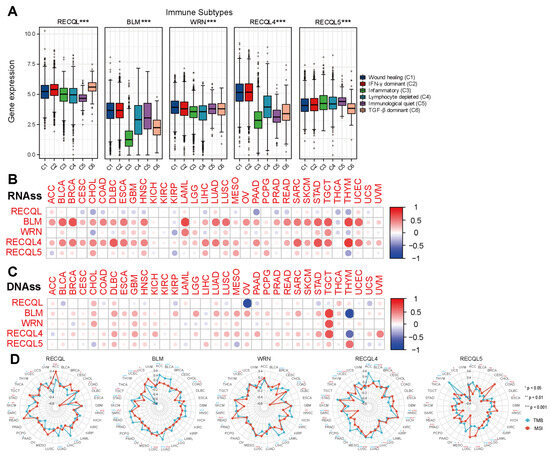 RECQ family expression correlated with immune subtypes, RNAss/DNAss, and TMB/MSI. (A) Expression of RECQ mRNA among pan-cancer immune subtypes. (B,C) To analyze the correlation between RECQs and tumor stemness by RNAss/DNAss. (D) To analyze the correlation between RECQs and TMB/MSI by Radar diagram. * p < 0.05, ** p < 0.01, *** p < 0.001.