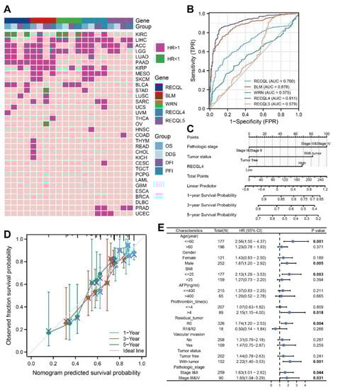 The clinical characteristics of RECQs in pan-cancers. (A) Correlation between RECQs mRNA expression and OS, DSS, DFI, and PFI from TCGA. (B) ROC curves for RECQs in LIHC samples and normal samples by TCGA and GTEx. (C) A nomogram to predict one-year, three-year, and five-year OS for patients with LIHC. (D) Nomogram calibration for Cox regression models and fitting analysis of actual situations. (E) RECQL4 expression in different subgroups assessed by univariate survival analysis.