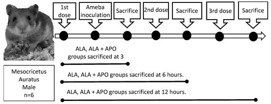 Scheme of control and experimental groups to evaluate the effect of apocynin on ALA development in hamsters. Hamsters weighing approximately 100 g were divided into two groups, one inoculated intrahepatically with 1 × 106 amoebae and the other group intrahepatically administered with apocynin at 1.64 mg/100 g of body weight every 8 h and subsequently inoculated with amoebas. Animals were sacrificed at 3, 6 or 12 h post-amoeba inoculation.