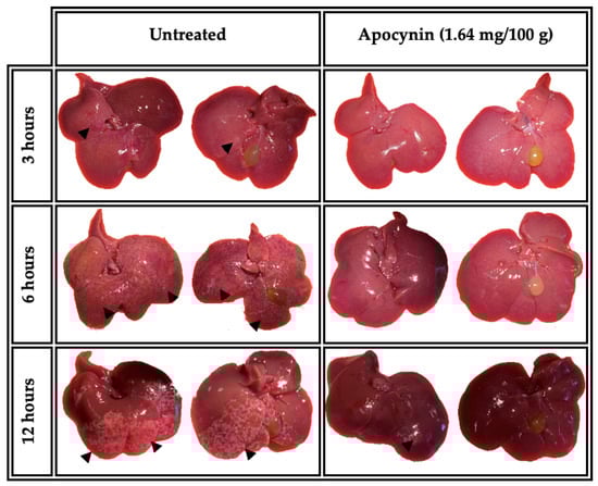 We evaluated whether apocynin has any effect on the evolution of ALA in hamsters. From macroscopic analysis, our results showed small pinkish dotted areas located mainly in the left lobe and slight clear zone (arrowhead) on the diaphragmatic side in the untreated group sacrificed at 3 h. At 6 h, the lesions evolved to pinkish plaques located in the left and middle lobe on both sides (diaphragmatic and visceral face), and at 12 h, amebic lesions were observed in the form of whitish plaques located in the left lobe and part of the middle and right lobes. In contrast, in the group treated with NOX inhibitor (apocynin) and inoculated with amoebae, only a small whitish fibrillar material was observed at 3 h. At 6 h, a small pink punctate zone was observed in the left lobe. At 12 h, a small yellowish area (arrowhead) was observed in the left lobe of the diaphragmatic side (Figure 2).