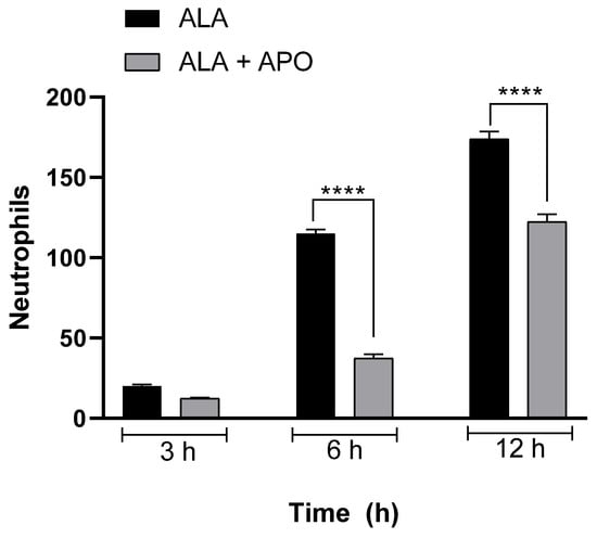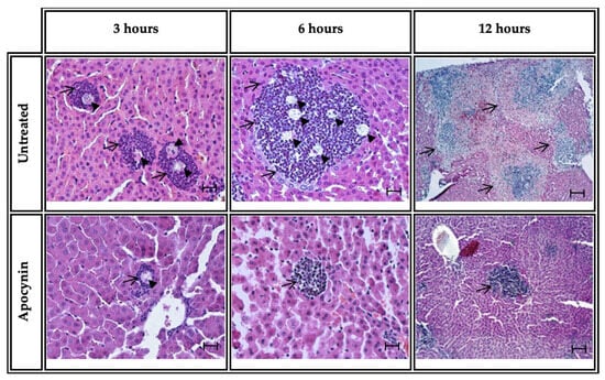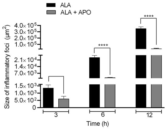 At 3, 6, and 12 h post-inoculation, liver tissue samples were processed to quantify inflammatory infiltrates in ALA. Hamster liver with ALA untreated (ALA) and treated with apocynin showed a gradual increase in the size of inflammatory foci at different times of evolution. At 3 h, there were no statistically significant differences in the size of the inflammatory foci between the ALA group and the ALA + Apo group; however, the ALA of hamsters treated with apocynin (ALA + APO) showed significantly smaller sizes of inflammatory infiltrates at 6 and 12 h of evolution versus the untreated ALA group (Figure 5).