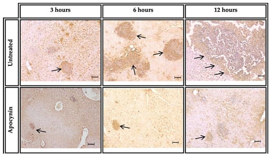 In our study, immunohistochemical analysis demonstrated positive NOX2 labeling in the areas of inflammatory infiltrates in both groups of hamsters. Previous work has shown the presence of positive NOX2 labeling in different pathologies and tissues where excessive ROS production plays an important role in the development and progression of disease [,]. However, positive labeling for NOX2 was lower in the inflammatory infiltrates of apocynin-treated hamsters than in the untreated group. In the untreated hamsters, extremely large areas of positive labeling were observed in the necrotic areas of the liver parenchyma. This discrepancy was best observed at 6 and 12 h after inoculation.