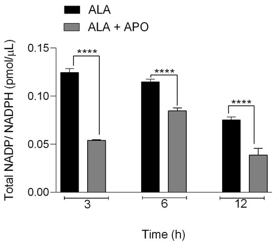 Determination of NADP/NADPH (pmol/μL) in ALA in hamsters treated and untreated with apocynin. Asterisks indicate statistically significant differences between the two groups; **** p ≤ 0.0001. Data represent mean ± SD.