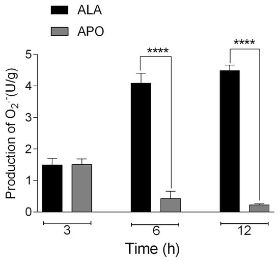 Determination of O2− production (U/g) in the ALA from hamsters treated with apocynin and untreated. Data represent the mean ± SD of three independent experiments. p values were determined by one-way ANOVA (**** p < 0.0001), comparing ALA with the APO group.
