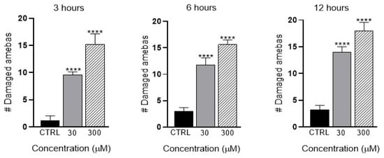 To determine the mechanisms involved in the effect of apocynin on ALA development, we quantified the effects of apocynin on the amoebae viability. For the assay, 30,000 E. histolytica trophozoites were incubated with 30 and 300 µM concentrations of apocynin at 3, 6 and 12 h. At 3 and 6 h, we observed statistically significant differences between the control and the doses used (30 and 300 µM), and the number of damaged amoebae gradually increased as the apocynin dose increased. At 12 h, we observed statistically significant differences between the control and 30, 300 µM of apocynin, and the number of damaged amoebae gradually increased (Figure 10).