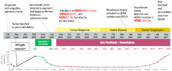 As a standard practice in the management of advanced or metastatic carcinoma, including AAC, molecular profiling of the tumor and analysis of ctDNA are routinely conducted and typically covered by health insurance in order to explore actionable biomarkers to help select treatment using molecularly targeted agents. In this report, tumor molecular profiling by multi-platform analyses revealed typical as well as novel genetic alterations (Table 1). DNA sequencing of the surgically resected AAC revealed genetic alterations in KRAS and CDKN2A, which are common pathogenic variants in AAC, as previously reported [25,26,27]. Cyclin-dependent kinases 4 and 6 (CDK4/6) act downstream of KRAS and CDKN2A, and they are potential targets of anti-cancer therapy. A clinical trial to investigate abemaciclib (an inhibitor of CDK4/6) in advanced or metastatic biliary tract carcinoma, including AAC (Clinicaltrials.gov Identifier: NCT04003896), can be considered for this patient [30].