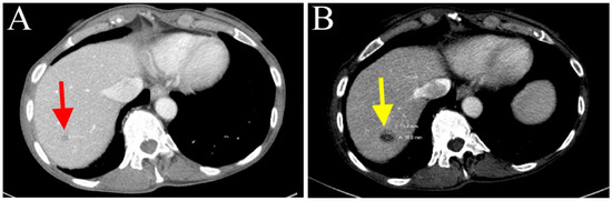 (A) Stable lesion in hepatic segment 7 after cycle 9 of gemcitabine/nab-paclitaxel treatment (depicted with red arrow). (B) Tumor enlargement after cycle 13 (depicted with yellow arrow).