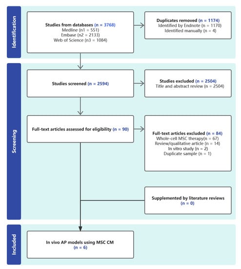 The Preferred Reporting Items for Systematic Reviews and Meta-Analyses (PRISMA) were used to guide the systematic search [28], and this systematic review has been registered on the international prospective register of systemic reviews (PROSPERO, id: CRD42023450919). Articles published up until 18 July were searched using Embase, Medline, and the Web of Science. In addition, the references from pertinent review articles for any studies that the database search might have missed were manually checked. Acute pancreatitis, mesenchymal stem cells, mesenchymal stromal cells, bone marrow mesenchymal stromal cells, umbilical cord mesenchymal cells, and stem cells were the keywords used. One researcher independently evaluated the relevance of the studies found by the systematic search by reading their titles and abstracts.