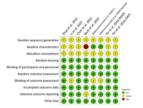 The assessment of allocation concealment resulted in an “unclear” risk of bias for studies that assigned animals to treatment and control groups without furnishing explicit details. Conversely, all studies provided explicit documentation of random housing, thus precluding a “high” risk of bias classification within the random housing domain. With unanimity, all studies underscored the blinding of participants and personnel, as well as the blinding of outcome assessors, warranting a “low” risk of bias designation.