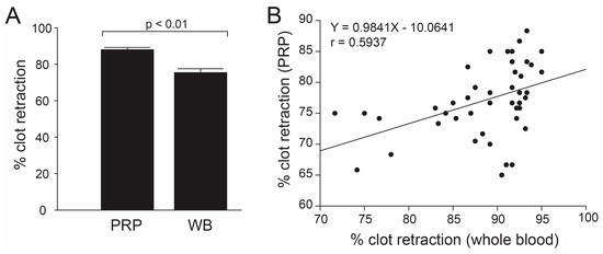 Correlations between two methods for measuring clot retraction: Whole blood assay (WB) was performed in the absence of anticoagulant and agonist, whereas the PRP assay (PRP) was induced by human α-thrombin using the citrated blood. The percentage of clot retraction was significantly less in the whole blood assay compared to the PRP assay ((A), Mann–Whitney U test, n = 53), and the results from the two methods were closely correlated ((B). Linear regression analysis, n = 53, p < 0.005).