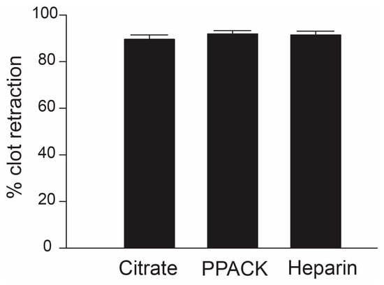 Although calcium is required for the thrombin action in blood coagulation as well as in platelet activation, clot retraction was normal in PRP using either EDTA or sodium citrate as an anticoagulant [37]. This is consistent with our finding that the percentage of clot retraction was similar in PRP containing sodium citrate, PPACK, or unfractionated heparin (Figure 3).
