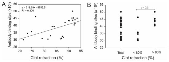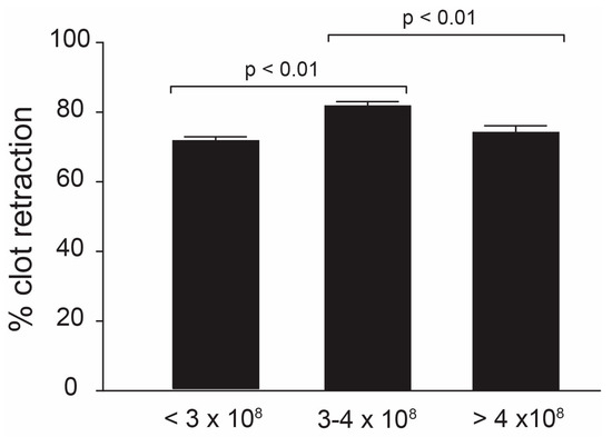 Because of its dependence on functional platelets, we determined the effect of platelet counts on clot retraction using whole-blood clot retraction, where platelet counts were not adjusted. We did not find an overall correlation between clot retraction and platelet counts (regression analysis, R2 = 0.003), but the percentage of clot retraction was greater in whole blood, with platelet counts of 300,000–400,000/μL compared to that with platelet counts either below or beyond this range (Figure 4, ANOVA, n = 14/group, p < 0.01).