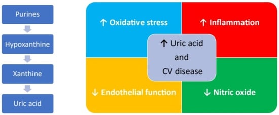 These basic findings have been corroborated by a more recent clinical evaluation on patients with acute coronary syndrome (ACS) [] by reporting that higher UA levels are associated with higher C-reactive protein (CRP) and troponin values. Additionally, ACS patients with high UA levels showed an angiographic picture of multivessel coronary artery disease and complex atherosclerosis according to the Ellis classification []. As regards the relationship between hyperuricemia and systemic arterial hypertension, several studies have shown an increase in blood pressure in patients with increased uric acid. A meta-analysis that studied 55,607 patients showed that for each 1 mg/dL increase in uric acid, the incidence of arterial hypertension increases by approximately 13% []. At the basis of this relationship, there would be the lower release of nitric acid and the activation of the renin–angiotensin–aldosterone system promoted by uric acid, which determine vasoconstriction and consequent increase in blood pressure. A relationship between hyperuricemia and increased onset of atrial fibrillation (AF) has been highlighted by the ARIC study, which shows a 1.16-fold increase in the risk of AF in subjects, mostly female and of African origin, with high UA values []. Atrial remodeling induced by the inflammatory effects and oxidative stress related to UA seems to be the underlying mechanism []. In light of the relationship between hyperuricemia and increased cardiovascular risk, the current therapeutic options mainly are represented by allopurinol and febuxostat, which inhibit the enzyme xanthine oxidase, and therefore, the UA production could have a role in reducing the incidence of cardiovascular events.