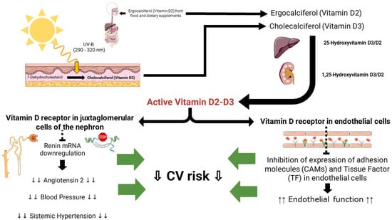 Beyond its well-known role in bone health, vitamin D has garnered increasing attention in relation to cardiovascular health. Numerous observational studies have investigated the link between vitamin D levels and CVDs. Although the results show some degree of variability, they consistently highlight an inverse association between vitamin D status and the risk of developing CVD [,,]. The inverse correlation between vitamin D status and CVD seems to be particularly strong in older adults [,]. Meta-analyses of epidemiological studies support the inverse correlation between vitamin D levels and CVD [,]. The correlation between vitamin D levels and arterial hypertension holds significant importance. Blood pressure tends to exhibit geographical and racial disparities, whereby the risk of hypertension tends to rise from south to north in the Northern hemisphere. A suggested explanation for this latitude-based correlation is that sunlight exposure may offer protection, potentially due to the influence of ultraviolet B (UVB) radiation or vitamin D []. This association appears to be supported by animal studies. Mice that lack the vitamin D receptor (VDR) or have a genetic deficiency in the 1-alpha-hydroxylase gene, which is responsible for vitamin D activation, have been shown to develop high renin hypertension and cardiac hypertrophy [,]. In vitro studies highlight a favorable cardioprotective effect of 1,25-dihydroxyvitamin D. It has been reported that the pretreatment of ECs with vitamin D reduce the expression and activity of TF and CAMs induced by oxidized lipids [] or interleukin-6 [], possibly preserving endothelial function.