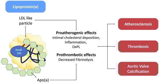 Lipoprotein(a), often abbreviated as Lp(a), is a lipoprotein particle that has garnered significant attention in the field of atherosclerotic CVD, becoming subject of intense research and debate in the last few decades []. The Lp(a) structure consists of a large and highly polymorphic glycoprotein referred to as apo(a) covalently bound to a molecule of apoB-100 []. In normotriglyceridemic individuals, apo(a) primarily associates with low-density lipoproteins (LDL). However, in dyslipidemic patients, apo(a) can also combine with apoB100 found in triglyceride-rich particles, specifically very low-density lipoproteins (VLDL) and intermediate-density lipoproteins (IDL) []. By the biochemical point of view, apo(a) is characterized by loop-like structures known as kringles, a structural motif also found in other coagulation factors, such as plasminogen (PLG), prothrombin, urokinase, and tissue-type PLG activators []. Elevated Lp(a) levels are thought to significantly contribute to atherosclerosis, primarily by interfering with macrophages []. Specifically, the macrophage’s receptor for VLDL can engage with a high affinity to Lp(a), facilitating its breakdown via endocytosis within lysosomes, resulting in its degradation and prompting the formation of foam cells with the deposition of cholesterol in atherosclerotic plaques []. This hypothesis gains support from observations that Lp(a) is widely present in human coronary atheroma and is more abundant in tissue from culprit lesions of patients with unstable coronary disease when compared to those with stable disease []. Furthermore, oxidized phospholipids present on Lp(a) trigger inflammation through a TLR 2-mediated pathway, exacerbating endothelial disfunction and contributing to increased inflammation within the arterial wall []. Lp(a) may also affect the coagulative homeostasis enhancing TF-mediated thrombosis and restrain the dissolution of clots [], interfering with fibrinolysis competing with plasminogen [,]. However, therapeutic efforts to reduce Lp(a) levels using an mRNA inhibitor (Pelacarsen) did not result in changes to fibrinolysis, suggesting that negatively affecting fibrinolysis might not be a clinically significant characteristic of Lp(a) []. Large epidemiological studies support a strong correlation between Lp(a) levels and atherosclerotic CVD []. Pooled data derived from 36 prospective studies involving a total of 126,634 participants revealed that age and sex corrected risk ratio for CVD increases with each rise in standardized concentrations of Lp(a) []; elevated CVD risk persisted even after adjusting for conventional CV risk factors []. Lp(a) concentration shows consistent associations also with risk of stroke []. Recently, Lp(a) has been linked also to the inflammatory and calcification processes that underlie aortic valve degeneration and progression of aortic stenosis []. A summary of its putative mechanisms is provided in Figure 5.