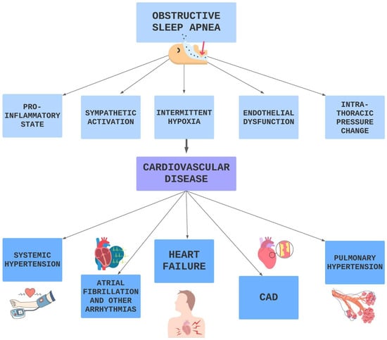 OSA represents an independent risk factor for CVDs, such as HTN, AF and other arrhythmias, HF, CAD, stroke, pulmonary hypertension, metabolic syndrome, and diabetes as shown in Figure 7. The involved mechanisms are multiple and probably interconnected.