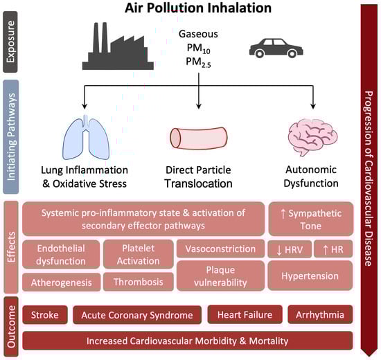 Air pollution is the contamination of the environment, indoor or outdoor, by a mixture of chemical, physical, or biological agents that change the characteristics of the atmosphere and even at low concentrations cause damage to human health, other living organisms and the environment []. According to the Global Burden of Disease (GBD) report, air pollution was responsible for 6.7 million deaths in 2019 alone [,]. Globally, nearly 20% of CVD deaths are attributable to air pollution []. The main components of this mixture of pollutants are Total Suspended Particulate Matter (PM), gaseous compounds including ozone (O3), nitrogen dioxide (NO2), carbon monoxide (CO), sulfur dioxide (SO2), and volatile organic compounds including benzene []. According to the World Health Organization, 99% of the world’s population breathes air that contains annual average levels of air pollutants that exceed guideline recommendations. Particularly high exposures have been documented in cities in Asia, western sub-Saharan Africa, and Latin America []. The most consistent evidence on health damage is attributed to PM, i.e., the set of airborne particles, ranging in diameter from 0.1 to 100 mm, capable of remaining in suspension in the air even for long periods [,]. Short- and long-term exposure to PM is associated with increased morbidity and mortality, impacting the progression of atherosclerosis [], ischemic heart disease [,,], stroke [], and lung disease as well as the course of pregnancy and the health of newborns []. PM10 (particles between 2.5 and 10 mm in diameter) and, largely, PM2.5 (diameter < 2.5 mm), are the most linked to CVD and affecting global public health [,]. Lung inflammation and oxidative stress pathway is the primary response to air pollution exposure [], contributing to the development of a systemic pro-inflammatory state and activation of secondary effector pathways that result in endothelial dysfunction, increased atherosclerotic plaque vulnerability, and the activation of a prothrombotic and proarrhythmic state [,,]. Experimental animal models seem indeed to support this hypothesis []. Moreover, human exposure to pollutant nanoparticles causes their translocation into the systemic circulation through the alveolus-capillary membrane, interacting with the endothelium, accumulating at sites of vascular inflammation, thus favoring atherosclerotic process [,,], with effects similar to those observed in the lungs [] and thrombotic complications []. A relevant change in platelet function toward increased prothrombotic tendency has been confirmed in diabetic patients after recent (within two hours) exposure to PM []. In addition to these mechanisms, short-term PM2.5 exposure in animal models is associated with sympathetic nervous system activation and hypertension, probably mediated by neuroinflammation [,]. In a meta-analysis of 33 studies, short-term exposure to PM2.5 was associated with a significant decrease in heart rate variability (HRV) []. Decreased HRV is an index of autonomic system dysfunction and predicts an increased risk of cardiovascular morbidity and mortality in patients with heart disease []. Increased blood pressure and decreased HRV suggest an autonomic imbalance in favor of sympathetic tone and could further explain the rapid cardiovascular responses associated with air pollution, such as the initiation of fatal tachyarrhythmias and increased myocardial infarctions [], as confirmed by the available literature []. High short-term exposure to PM2.5 is associated with an increased risk of acute coronary event, acutely destabilizing and rupturing atherosclerotic plaque, in patients with clinically significant pre-existing CAD but not in those with uninjured coronary arteries []. Moreover, short-term exposure to elevated levels of PM2.5 and PM10 is also associated with increased daily hospitalizations for STEMI and increased incidence of STEMI-related ventricular arrhythmias and cardiac death []. The effect of long-term exposure to major air pollutants was assessed by the ESCAPE study that have evaluated the incidence of acute coronary events in 11 European cohorts. At a mean follow-up of 11.5 years, exposure to annual mean levels of PM2.5 > 5 μg/m3 and PM10> 10 μg/m3 was associated with a 13% and 12% increase in the risk of nonfatal acute coronary events, respectively, with no evidence of heterogeneity between cohorts []. Other observational studies and meta-analyses have reported a positive correlation between long-term exposure to air pollution and the development and progression of subclinical atherosclerosis and calcium accumulation [] as well as increased carotid intima-media thickness []. Based on the published data, no more doubts should exist on the role of air pollutants in CVD development. A schematic view of the relationship between air pollution and CVD is provided in Figure 8.