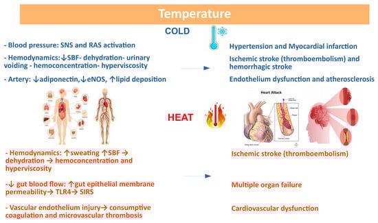 On the contrary, exposure to heat leads to increased blood flow and sweating with loss of fluids and dehydration. The resulting hemoconcentration and hyperviscosity may cause thromboembolism, leading to increased risk of ischemic stroke []. In the presence of heat stroke, the increase in core temperature redistributes the flow on the skin to facilitate heat loss. Intestinal blood flow is reduced, and this could cause increased permeability of the intestinal epithelium, allowing bacteria, their toxic cell wall component LPS, or HMBG1 to move from the intestinal lumen into the circulation. TLR4 recognizes these molecules, stimulating innate and adaptive immune responses and causing systemic inflammatory response syndrome (SIRS). Along with this, hyperthermia induces the occlusion of arterioles and capillaries (microcirculatory thrombosis) or excessive bleeding (consumptive coagulation), leading to multiorgan dysfunction. The putative mechanisms linking climate changes and CVD is provided in Figure 9.