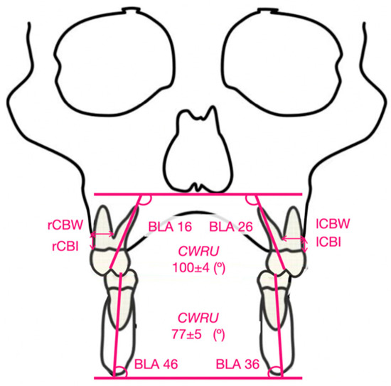 Indicators of BLA, CBI, and CBW. Angulation standard in the maxillary and mandibular molars according to CWRU.