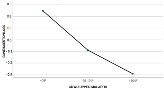 In cases where the CWRU was less than 96° at the beginning of the treatment, a slight bone insertion gain (0.24 ± 0.61 mm) was observed, whereas if the CWRU was 96–104° (−0.08 ± 1.05 mm) or higher than 104° (−0.29 ± 1.06 mm), a slight bone insertion loss was observed. These differences were not significant (F = 0.874, p = 0.427), as seen in Figure 4.