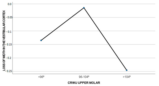 Regarding labial cortical bone loss, a slight loss was observed in all the groups, but the least loss was observed in the CWRU = 96–104° group (−0.01 ± 0.69 mm). There was a greater loss for the CWRU > 104° group (−0.24 ± 0.61 mm) and a median loss for the CWRU < 96° group (−0.13 ± 0.53 mm).