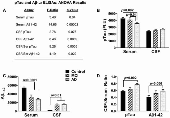 AD clinical biomarkers: The levels of immunoreactivity corresponding to amyloid-beta peptide, 1–42 (Aβ1–42), and phospho-tau (pTau-307) were measured in serum and CSF samples from normal control, MCI, and AD study participants by ELISA. Measurements are expressed as fluorescent light units (FLU). (A) ANOVA test results (F-ratios and p-values). Graphs depicting the mean ± S.D. of (B) pTau immunoreactivity, (C) Aβ1–42 immunoreactivity, and (D) the calculated CSF:serum ratios of pTau and Aβ1–42. Significant inter-group differences detected by the post hoc Tukey–Kramer multiple comparisons test are shown in the panels.